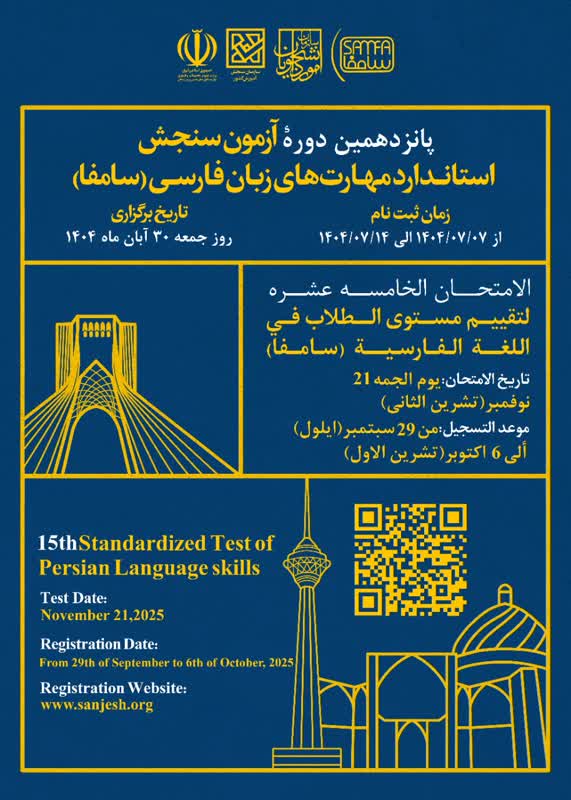 به اطلاع می رساند؛ پانزدهمین دوره آزمون سنجش استاندارد مهارت های زبان فارسی (سامفا) توسط سازمان سنجش آموزش جمهوری اسلامی ایران در روز جمعه 30 آبان ماه 1404 (پوستر پیوست) برگزار خواهد شد. تاریخ ثبت نام، برگزاری آزمون و وب سایت ثبت نام آزمون یاد شده به شرح ذیل اعلام میگردد: