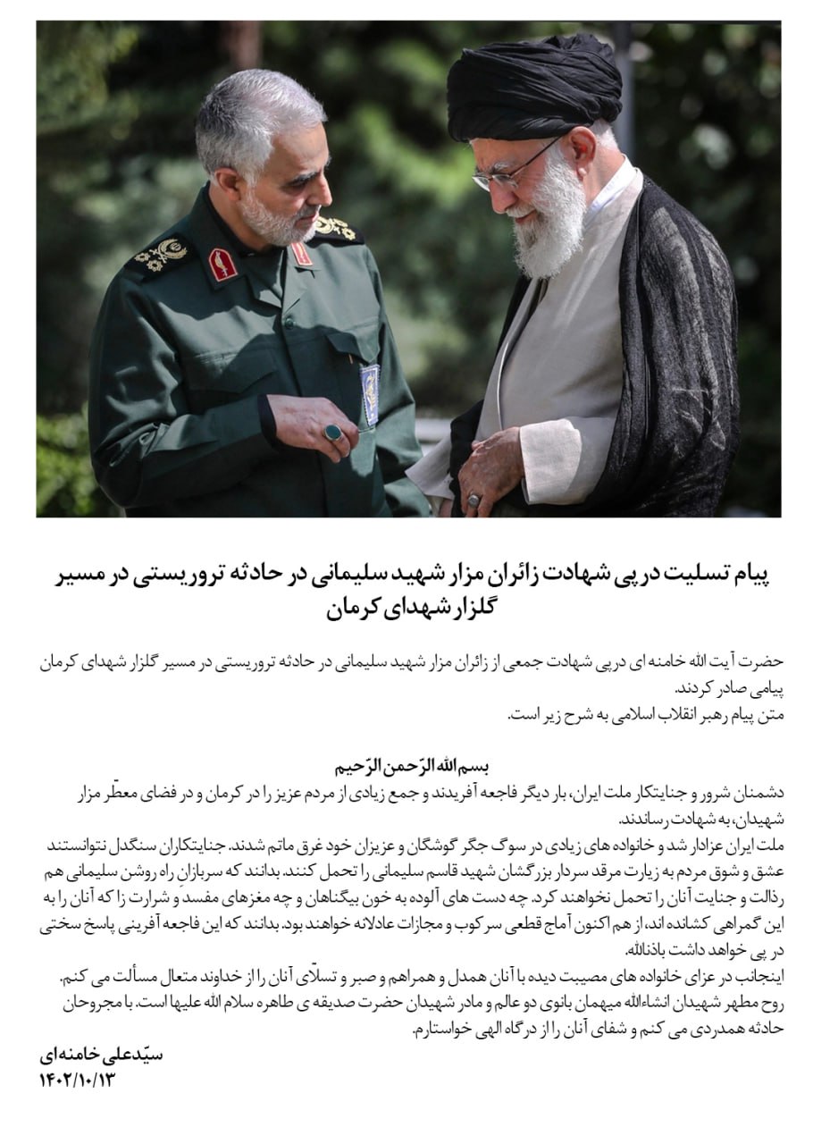 پیام حضرت آیت الله خامنه ای در پی شهادت زائران مزار سردار شهید حاج قاسم سلیمانی در کرمان